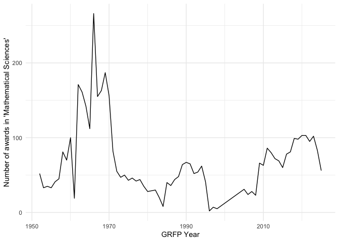 grfp_math <- grfp[grepl("Mathematical Sciences", grfp$Field.of.Study),] |> subset(award_level=="Awardee")