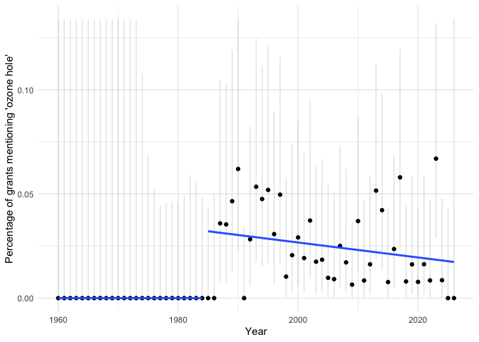 #> [1] "Finished first batch"The ozone hole was discovered in 1985: pollution led to a depletion of the ozone layer, which shields people (and other organisms) from a great deal of UV radiation. The world came together and passed the Montreal Protocol to limit the pollution, chlorofluorocarbons, that was causing the damage. The hole is healing, but still requires research and monitoring. We can see how NSF grants mentioning “ozone hole” changed over time (though not all grants mentioning “ozone hole” study this issue; some could be using it as a comparison to some other issue, for example). We can include a regression before and after 1985 and show the 95% CI for the proportion in each year (truncated by the y-axis limits).