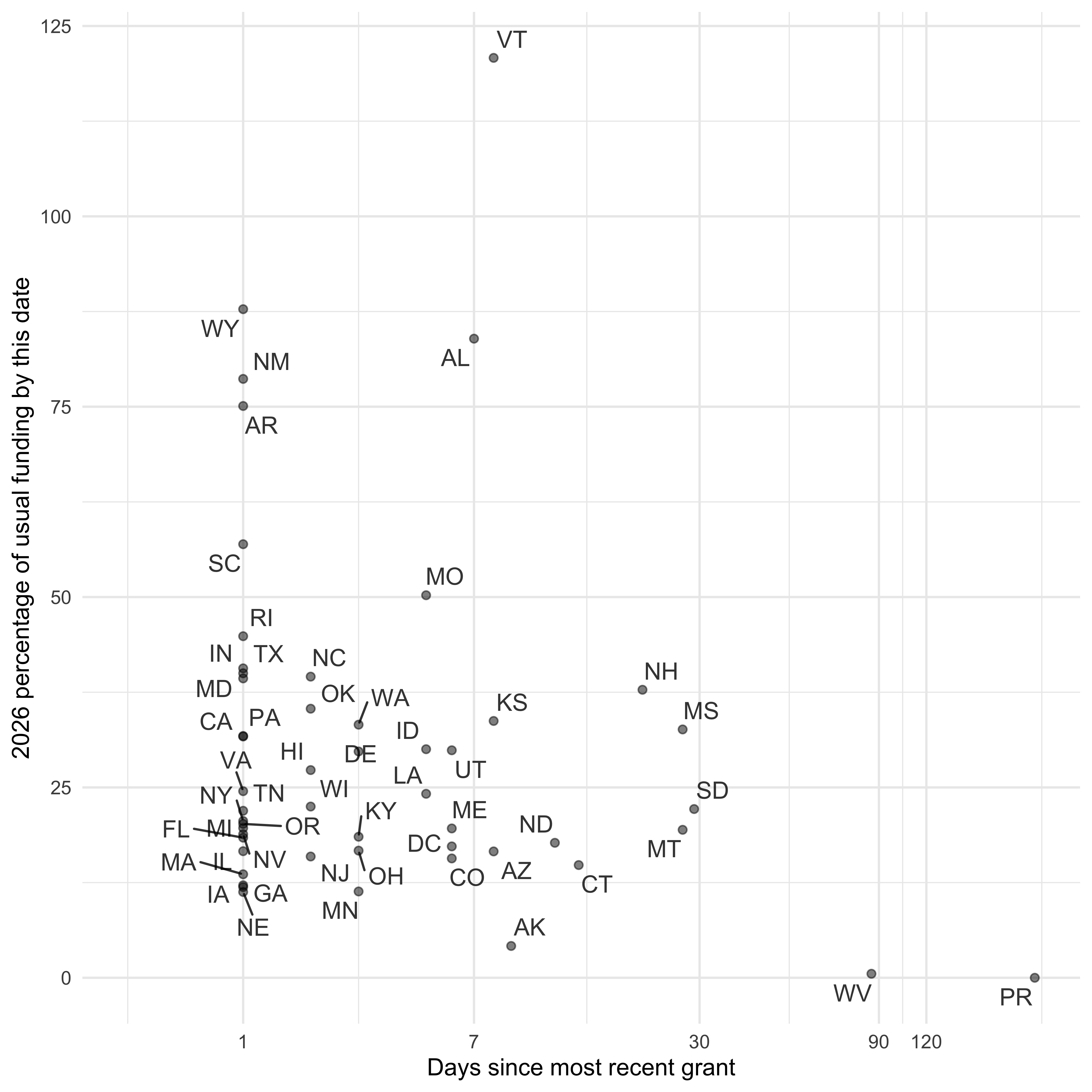 g <- ggplot(grants_comparison, aes(x=days_since_grant, y=percentage_usual_funding_by_this_date, label=awardeeStateCode)) + geom_text_repel(max.overlaps=50, alpha=0.8) + theme_minimal() + xlab("Days since most recent grant") + ylab("2026 percentage of usual funding by this date") + geom_point(alpha=0.5) + scale_x_continuous(trans='log1p', breaks=c(1, 7, 30, 90, 120, 365, 2*365), limits=c(0, NA))