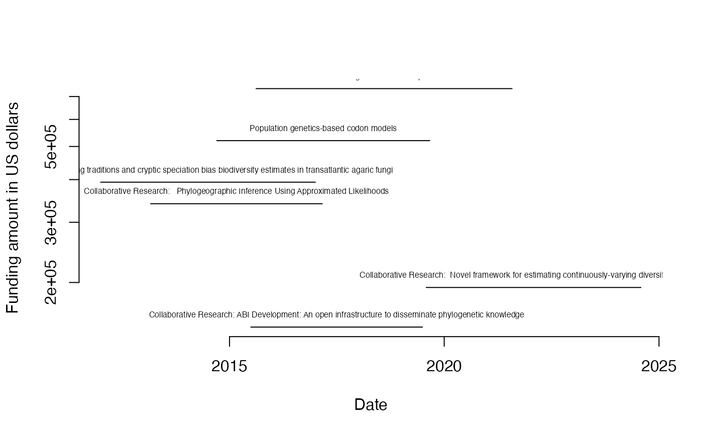 text(x=mean(c(lubridate::mdy(bco$startDate)[grant.index], lubridate::mdy(bco$expDate)[grant.index])), y=as.numeric(bco$fundsObligatedAmt[grant.index]), labels=bco$title[grant.index], pos=3, cex=0.5)