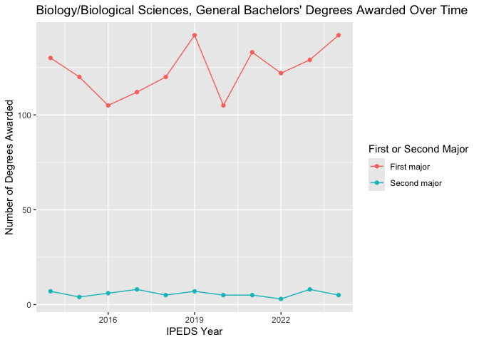 bio_degrees <- completions |> dplyr::filter(Classification=="Biology/Biological Sciences, General", Degree=="Bachelors", focal==TRUE)